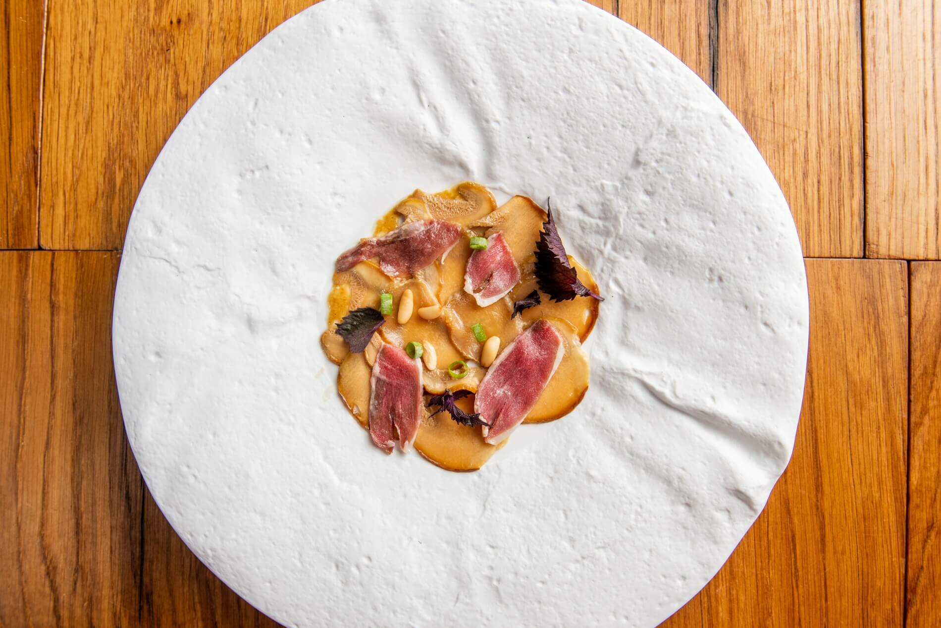 Ànec laminat amb poma i pinyons